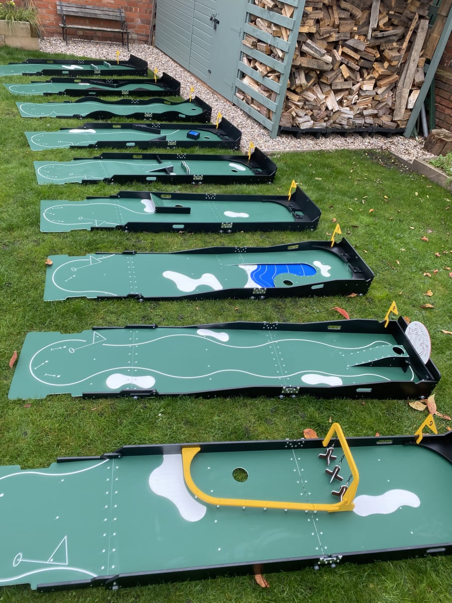 We don’t settle for flimsy equipment. Our course uses reinforced plastic that’s built for durability and safety - so you can forget about splinters. This design also works well both indoors and outdoors, allowing us to set it up quickly whenever time is limited. Each of the nine holes is about 8ft by 2ft when in use, complete with humps, fences, and rebounds to keep everyone interested.