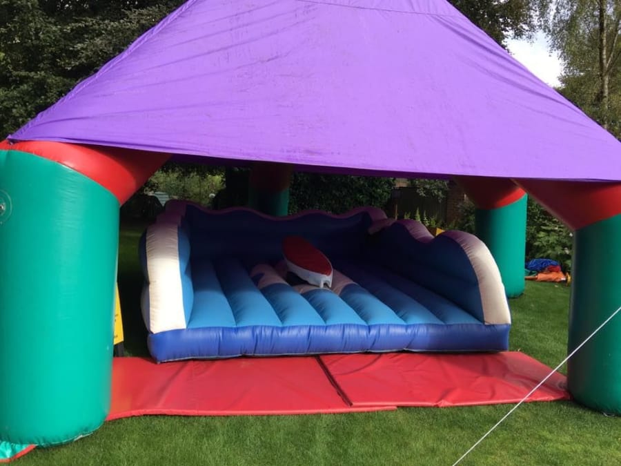 Unfortunately the Rodeo bull or surf machine shower cover does have some limitations of use, the two main issues being wind and the ability anchor it down securely on hard standing. Preferably it needs to be set up on grass because it can then be anchored down in the same manner as our bouncy castles and other inflatables however, the Rodeo bull or surf board shelter can be used on hardstanding provided it can be held down securely at each leg.