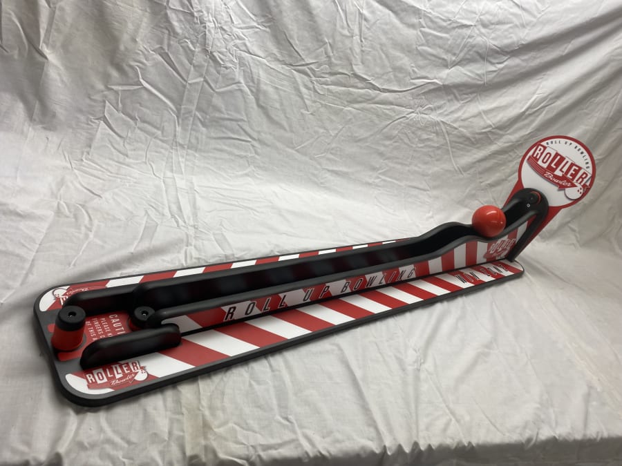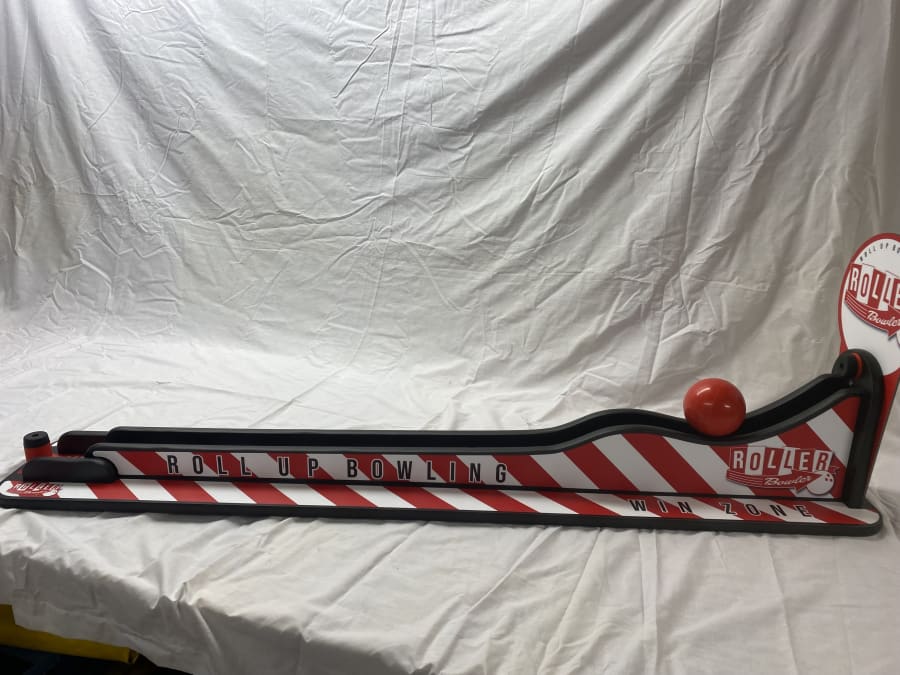 Roller Bowling can be best described as a cross between bowling and shuffle board. The aim of the game is to roll the ball along the rails and over the hump so the ball comes to rest in the dip at the end of the rails. Push too hard and the ball will roll over the hump, hit the stop and roll back down to the start point. Push the ball too lightly and it wont have enough momentum to get over the hump. Sounds easy does'nt it?
